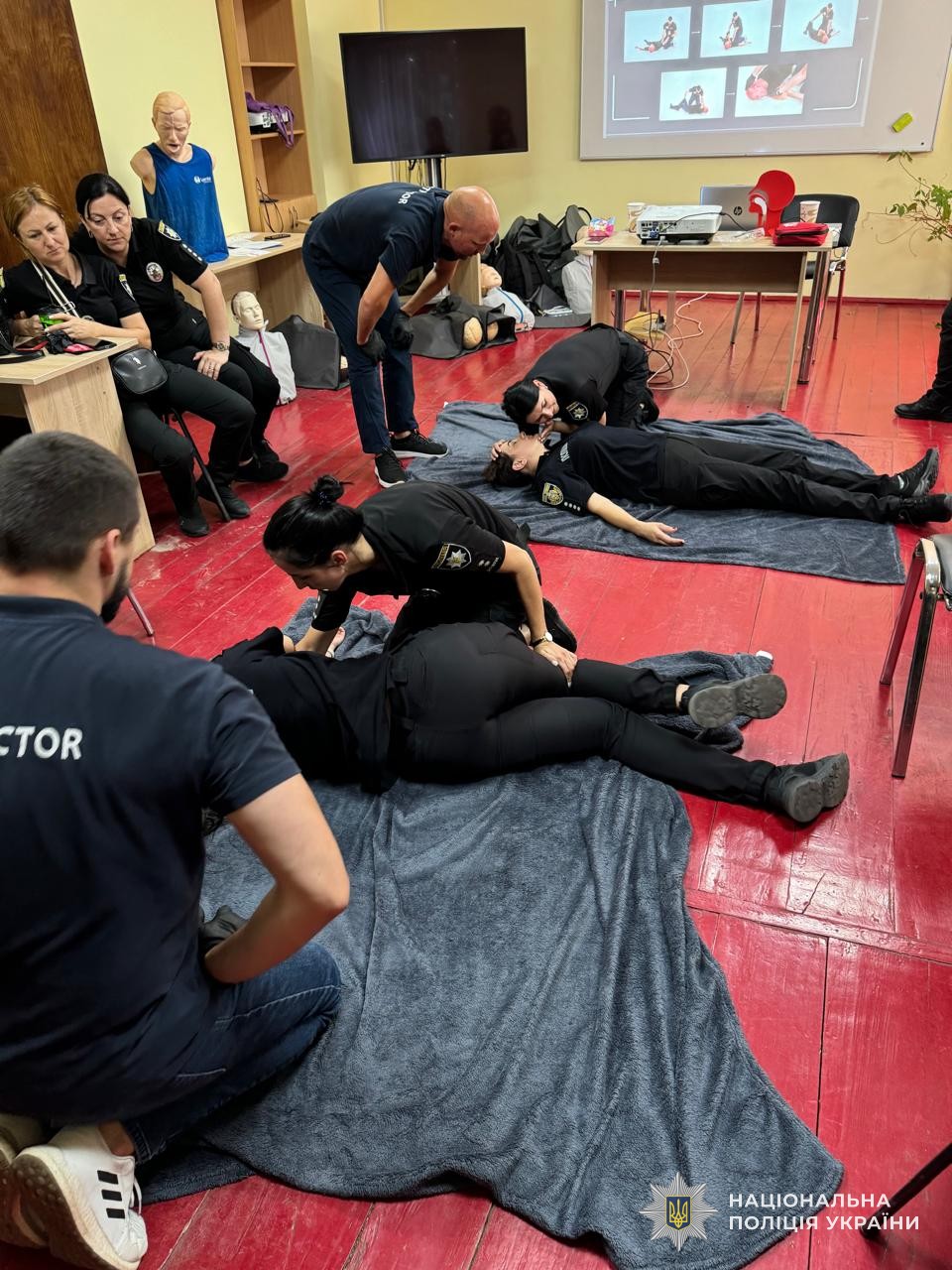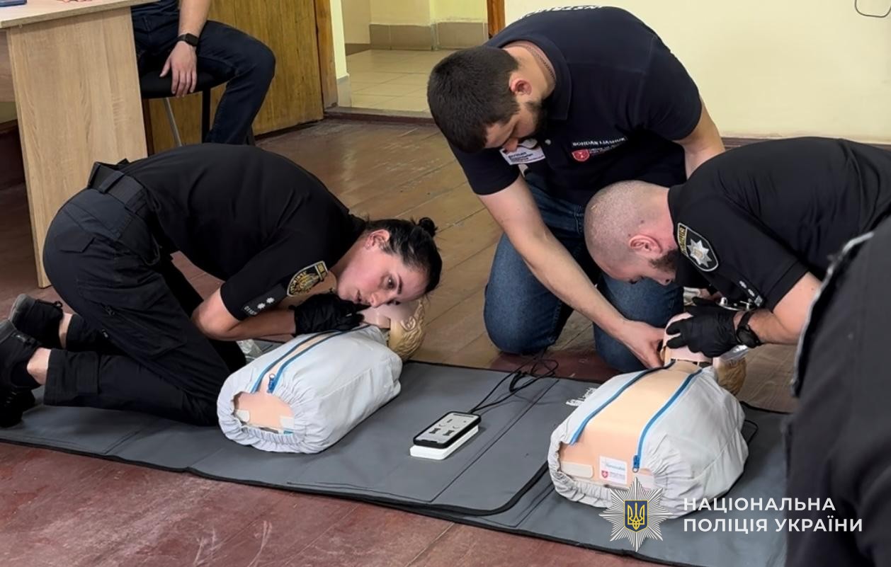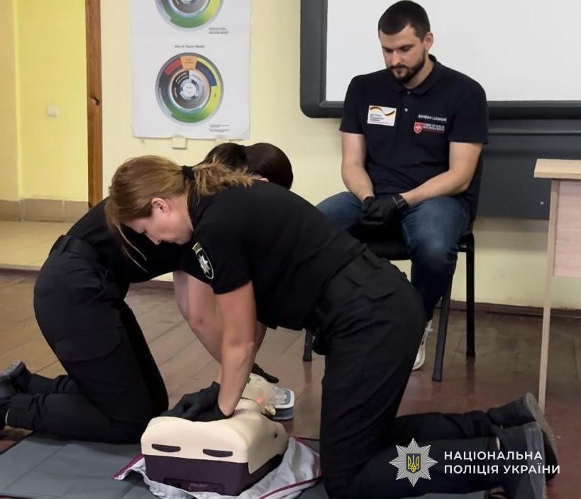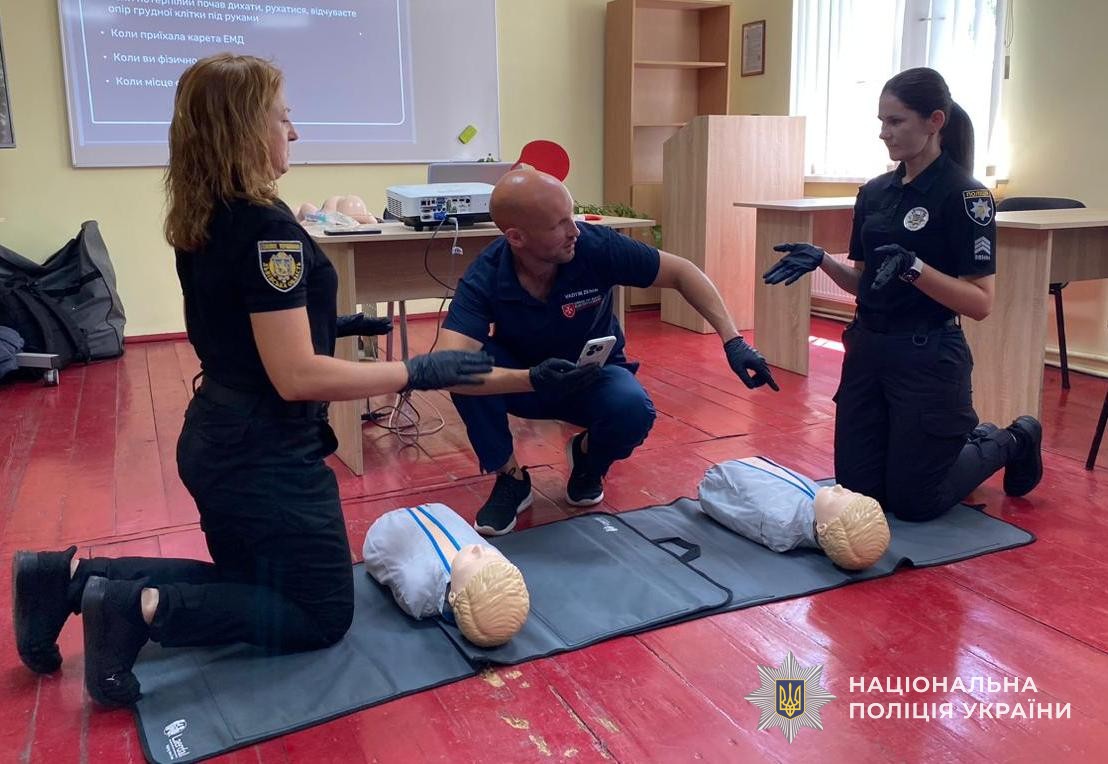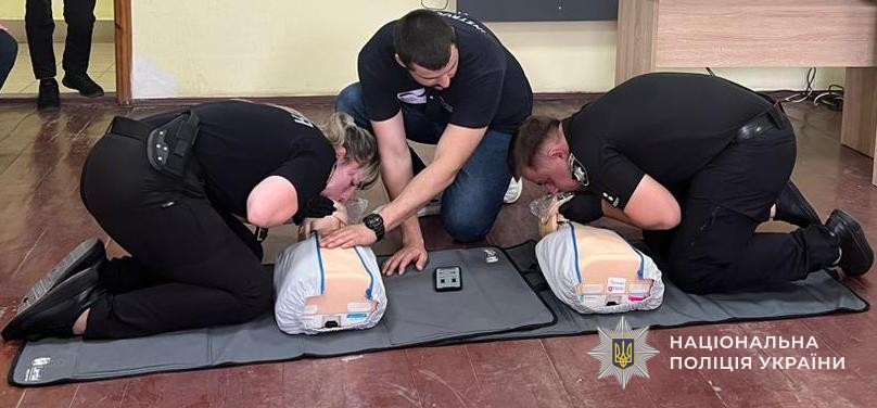 Техніка виконання компресій, алгоритм використання дефібритяторів та надання допомоги при непрохідності дихальних шляхів – такими були головні теми занять. Окрім того, правоохоронці вдосконалювали навички у зупинці різних видів кровотеч, правила накладання пов’язок, бандажів і шин, техніку масажу серця та штучного дихання.
