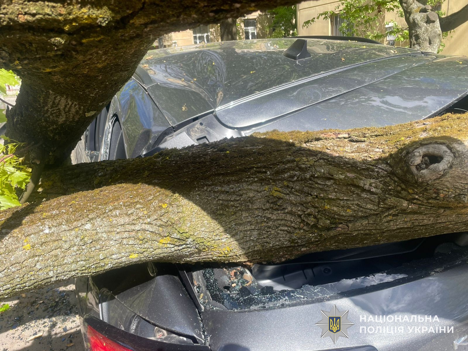 Близько 11:00 на вулиці Тарнавського у Львові вітер повалив дерево, яке впало на автомобіль Ford. Поліцейські виїжджали на місце події - забезпечували нормальний рух транспорту та обмежували доступ до ділянки, де під час падіння дерева також були пошкоджені лінії електропередач.