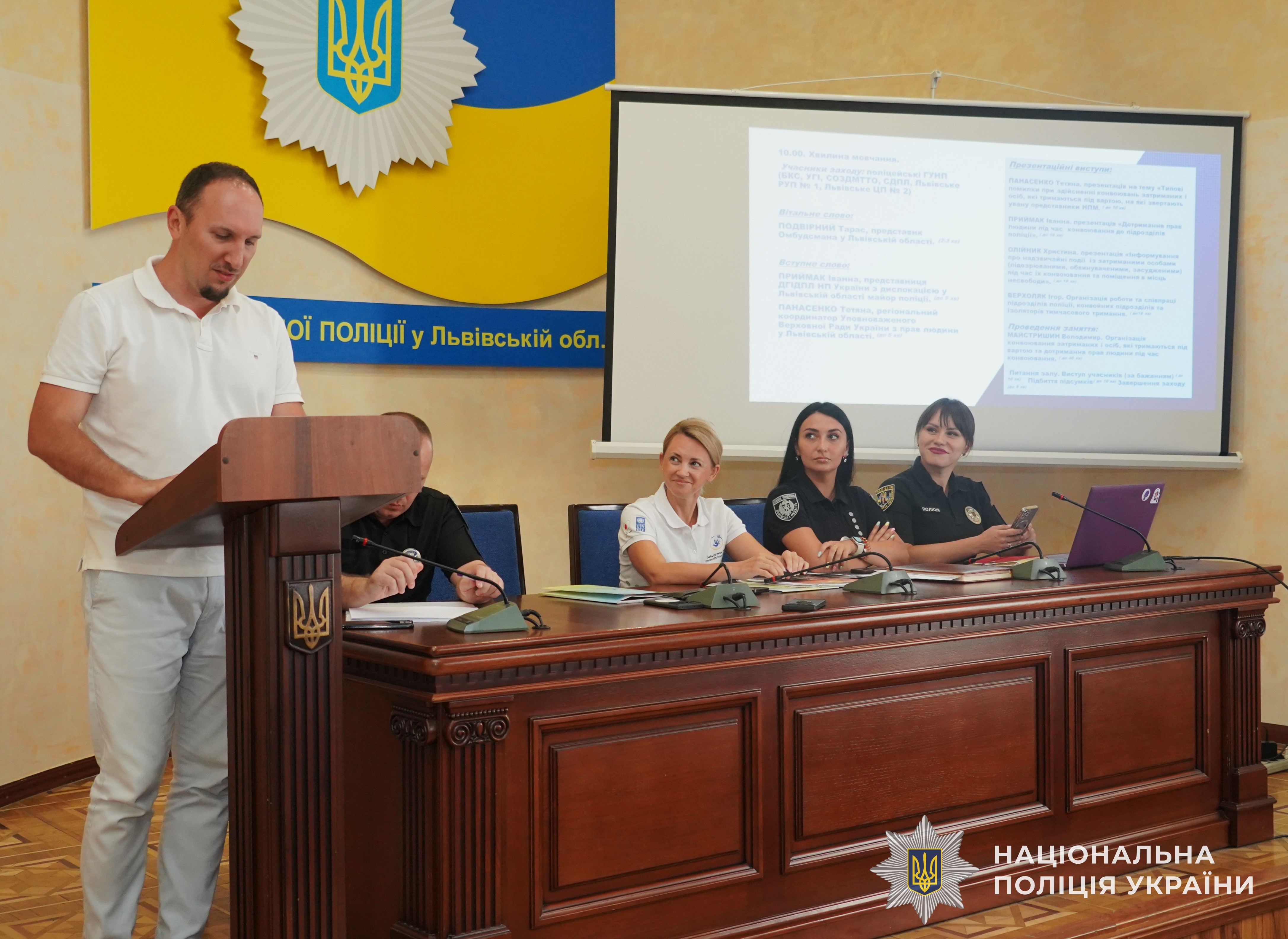 Своїм досвідом з правоохоронцями поділилися представник Уповноваженого Верховної ради України з прав людини у Львівській області Тарас Подвірний, регіональний координатор взаємодії з громадськістю Уповноваженого Верховної ради України з прав людини у Львівській області Тетяна Панасенко, начальник сектору організаційного забезпечення діяльності місць тимчасового тримання осіб поліції Львівщини майор поліції Ігор Верхоляк, начальник сектору конвойної служби Управління превентивної діяльності поліції Львівщини підполковник поліції Володимир Майстришин та інші.