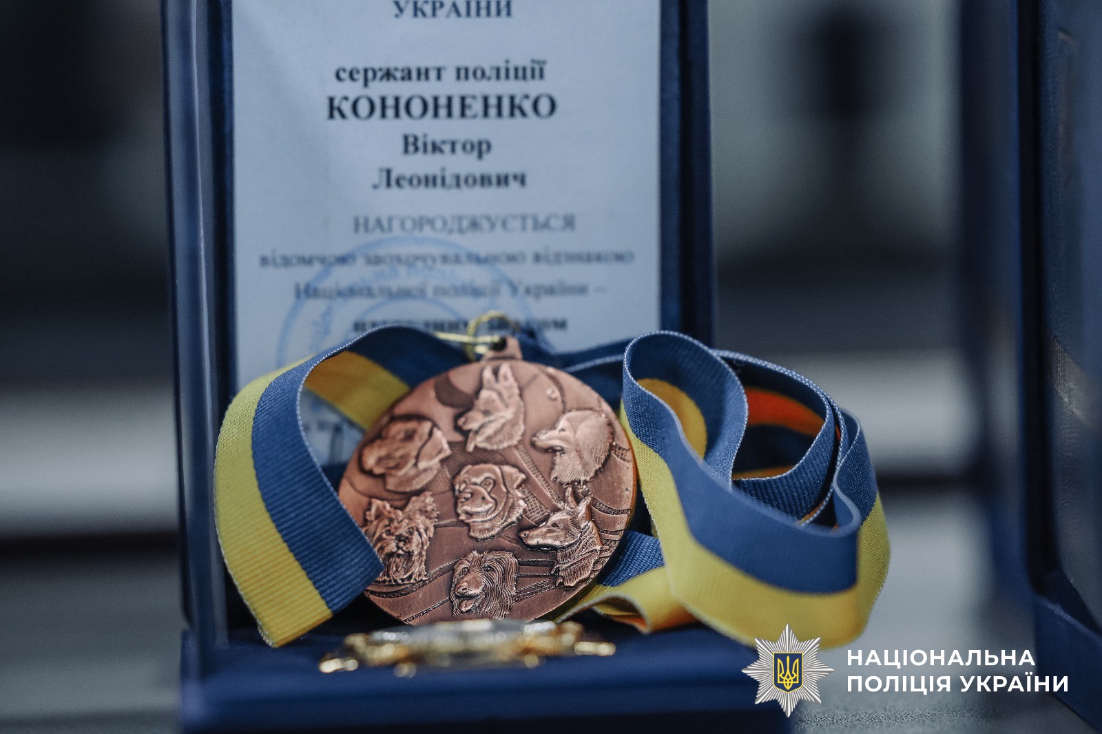 Ще одну нагороду отримав молодший інспектор-кінолог кінологічного центру ГУНП у Дніпропетровській області Віктор Кононенко разом зі своїм помічником Марсом. Службовому собаці сім років, у тандемі вони працюють уже два роки. Марс спеціалізується на пошуку вибухових речовин, зброї та боєприпасів.