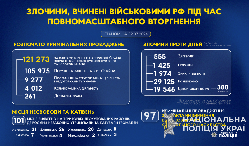 З початку повномасштабного вторгнення росії в Україну слідчі Національної поліції України розпочали 121 273 кримінальних проваджень за фактами вчинення на території України злочинів військовослужбовцями збройних сил російської федерації та їхніми пособниками.