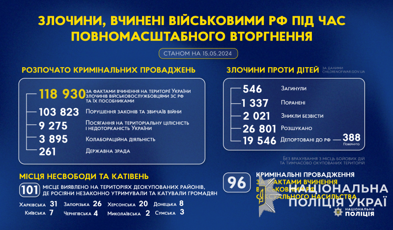 З початку повномасштабного вторгнення росії в Україну слідчі Національної поліції України розпочали 118 930 кримінальних проваджень за фактами вчинення на території України злочинів військовослужбовцями збройних сил російської федерації та їхніми пособниками.