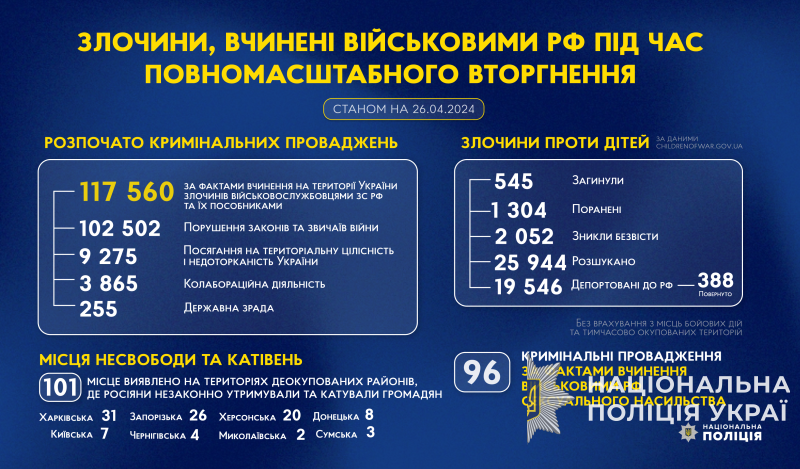 З початку повномасштабного вторгнення росії в Україну слідчі Національної поліції України розпочали 117 560 кримінальних проваджень за фактами вчинення на території України злочинів військовослужбовцями збройних сил російської федерації та їхніми пособниками.